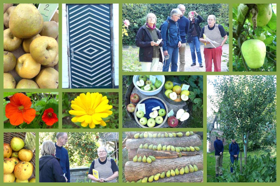 Neun historische Äpfelsorten wachsen auf dem Grundstück. Und jeder Baum wurde von uns einzeln ausgiebig begutachtet und fachlich betrachtet. Carola hatte einen selbstgebauten Apfelpflücker dabei und jede Sorte wurde probiert. Da schmeckte dem einen der "Celler Dickstiel", dem anderen die "graue Kanada Renette" . Eigentlich bräuchten einige der Bäume mehr Platz. Weil sie ganz schön in die Höhe oder Breite wollen (z. B. der Holsteiner Cox). Nicht immer bestimmt die Unterlage das Wachstum. (Dazu schon mal eine Vorankündigung: Carola wird im November für unsere Gruppe einen Fachvortrag halten zum Thema: "Das Wesen eines Obstgehölzes" ) Leider greift die Fruchtmonilia wie an vielen anderen Orten auf den Bäumen um sich. Da hilft nur, vermatschtes Obst zu entsorgen. Aber insgesamt sahen die Bäume sehr gesund aus mit dunklem Laub. Besonders begeisterte uns eine so voller Früchte hängende Sämlingssorte, das schon ein Zweig abgebrochen war. Die Sorte wartet noch auf einen Namen ("Der Schöne aus Hagen?"). Bei der Bürgermeisterbirne mußte dann aus dem Buch von Alma de l`Aigle vorgelesen werden. Susanne hat sich mit der Historie des Familiengartens in Hamburg Eppendorf ausgiebig beschäftigt und vor einigen Jahren dort schon Führungen angeboten (wir waren auch in kleiner Gruppe dabei). Bildhaft werden in dem Buch die dort gewachsenen Obstsorten des frühen 20ten Jahrhunderts beschrieben.